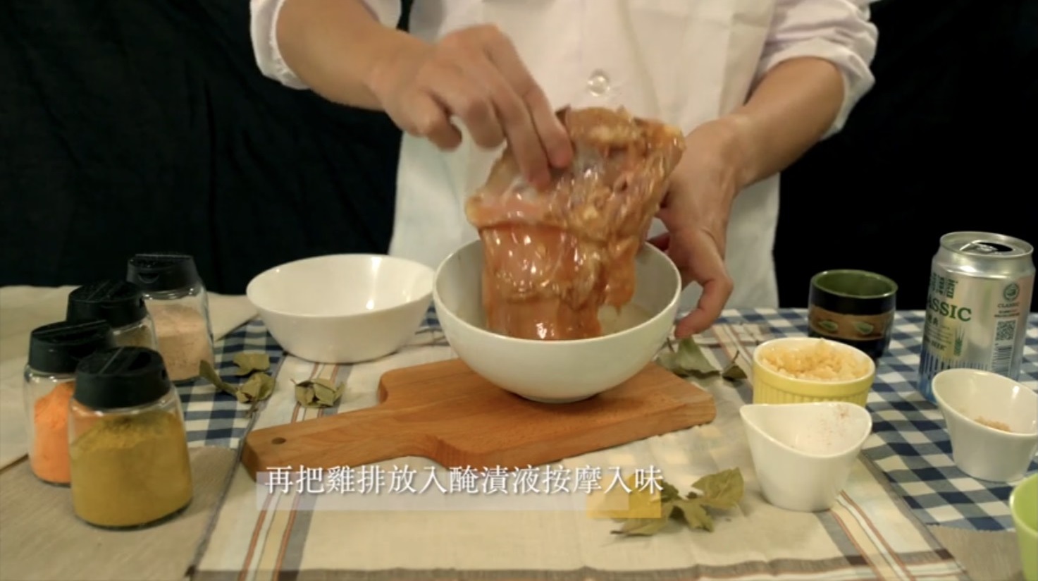 第二步:將整片雞排進入醃漬液,按摩入味,並靜置一段時間。