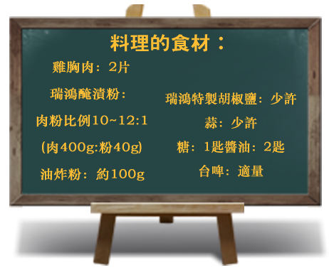 第三步:第三步:先裹上油炸粉第一次,靜置待其反潮(反潮能讓雞排的皮肉較不容易分離),再進行第二次裹粉。