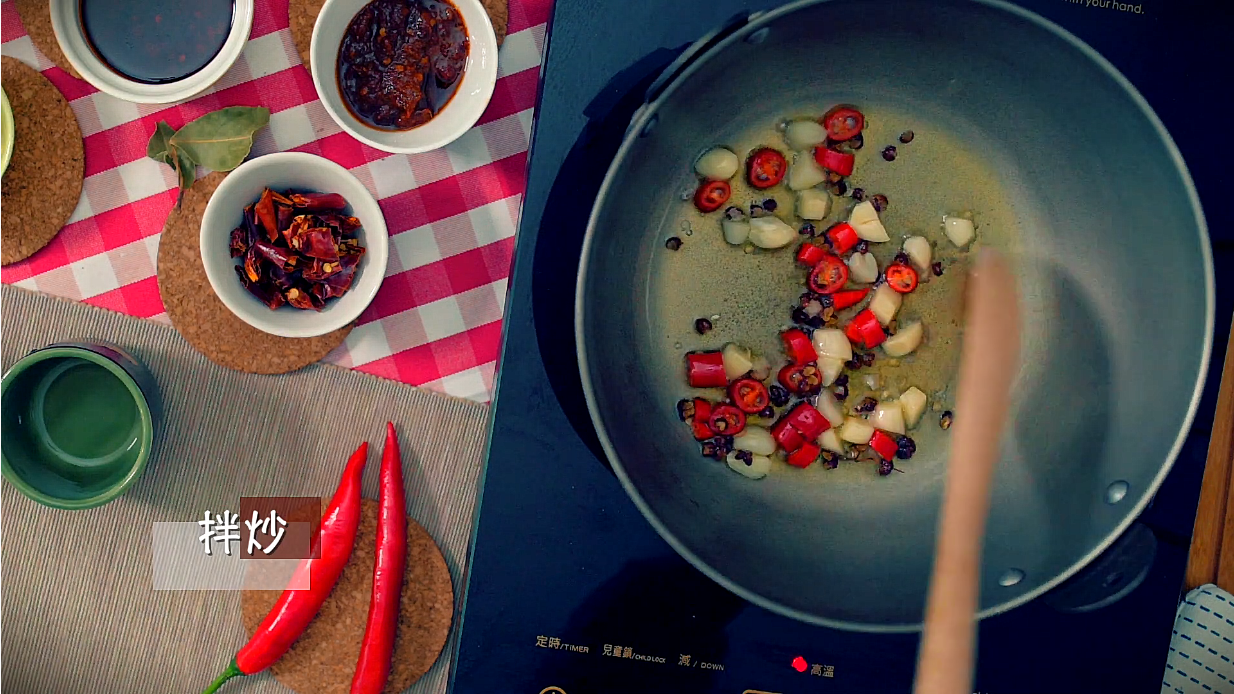 第一步:加入油適量加熱,待油熱後加入大蒜、辣椒、青花椒拌炒爆香。